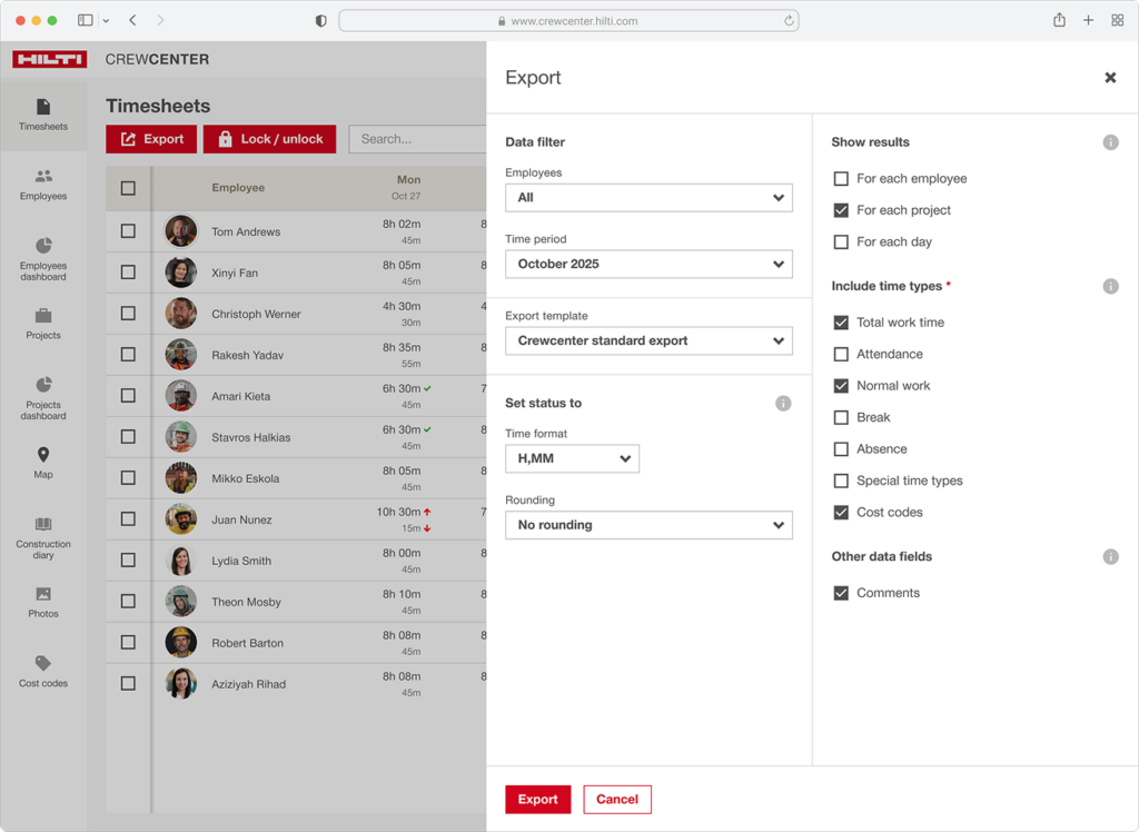 Yes. CrewCenter includes an export feature that lets you download data in Excel or CSV formats. This makes it easy to integrate with payroll, accounting, or ERP systems commonly used in your region.