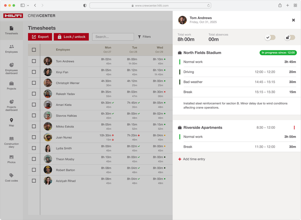 - Supervisor Entry: Foremen can record time for their teams—live or after the fact.